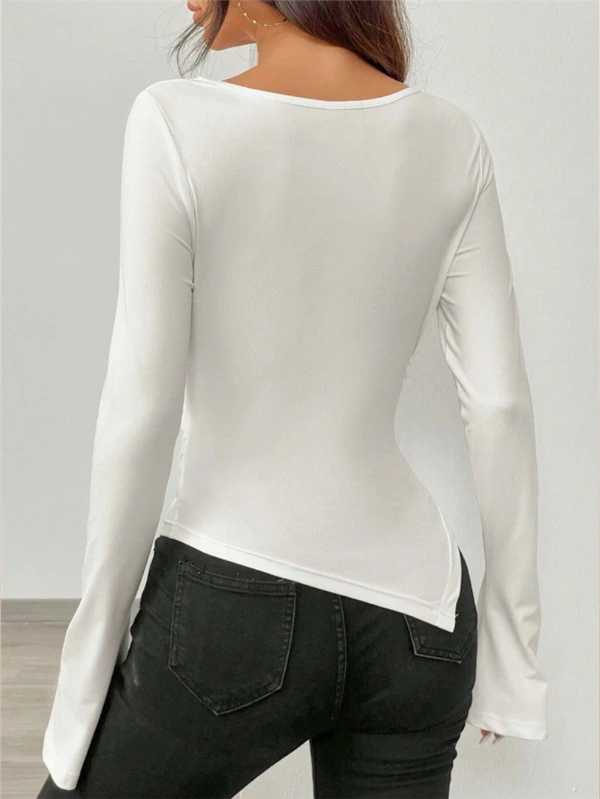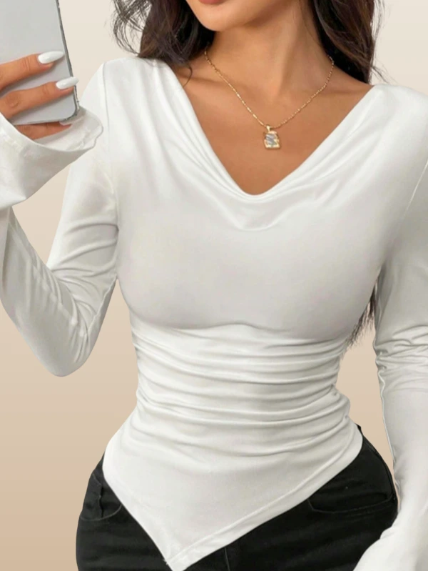 This fitted long sleeve top women love is crafted to gently shape the body without feeling restrictive. The clean neckline and smooth finish offer a polished look, while the asymmetrical hem top detail adds subtle edge and visual interest.