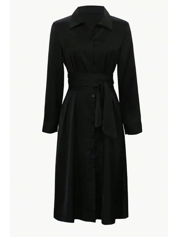 This midi shirt dress features a collared neckline and long sleeves that create a clean, balanced look. The adjustable tie waist allows you to define your shape while maintaining comfort and flexibility throughout the day. Crafted from a smooth, lightly elastic fabric, it moves with ease while maintaining a sleek, polished appearance.