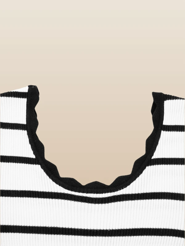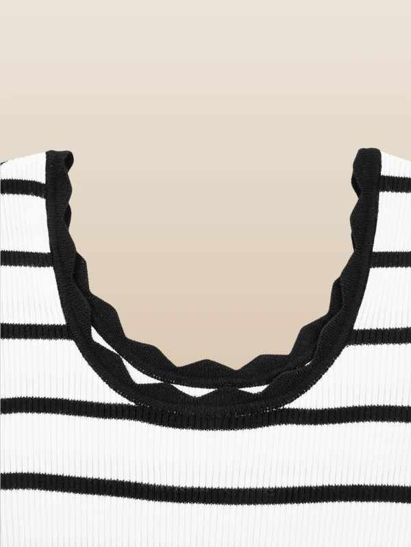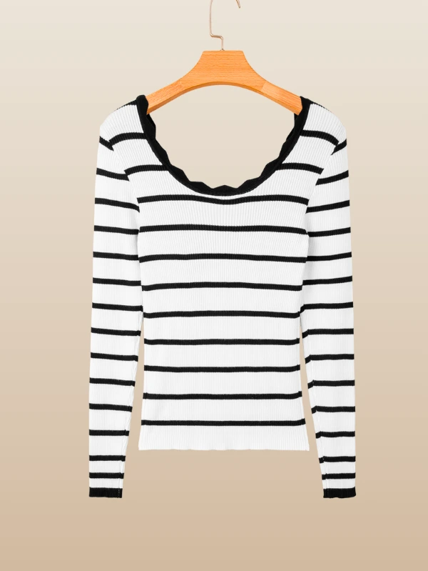 Designed for easy outfit building, this top pairs naturally with denim, skirts, or tailored bottoms for casual or elevated looks. The scalloped neckline striped knit top detail adds personality while keeping the overall aesthetic clean and wearable. A reliable wardrobe staple, it transitions seamlessly from day styling to relaxed evening outfits.