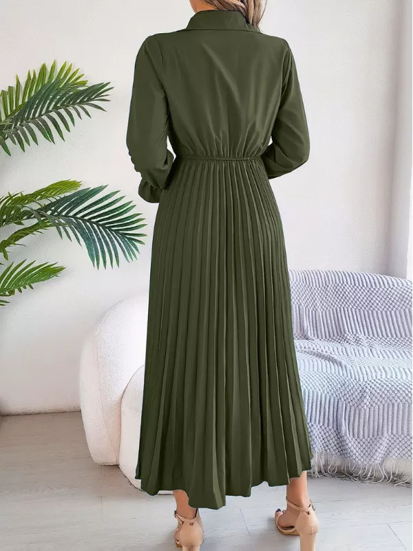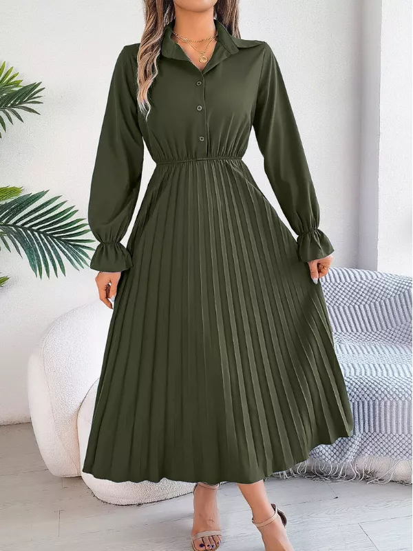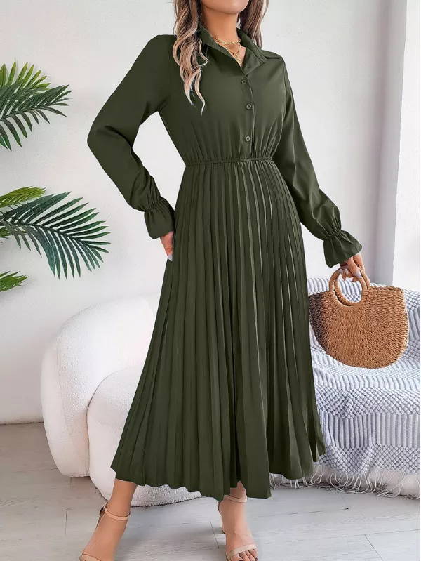 Graceful and thoughtfully designed, this pleated half button long sleeve midi dress blends soft structure with effortless elegance. Featuring delicate pleating and a half-button front, it offers a refined silhouette that feels polished yet easy to wear—perfect for modern, everyday dressing.