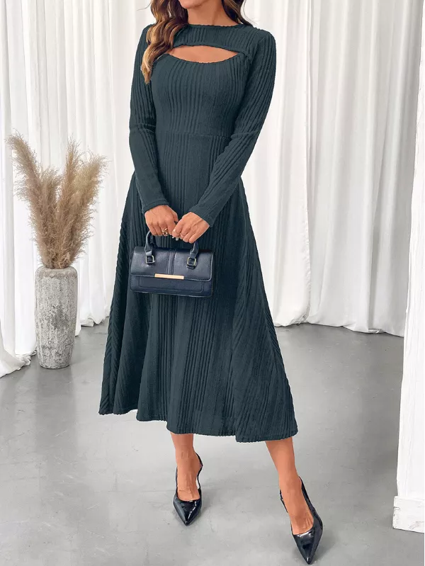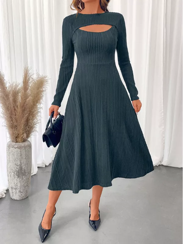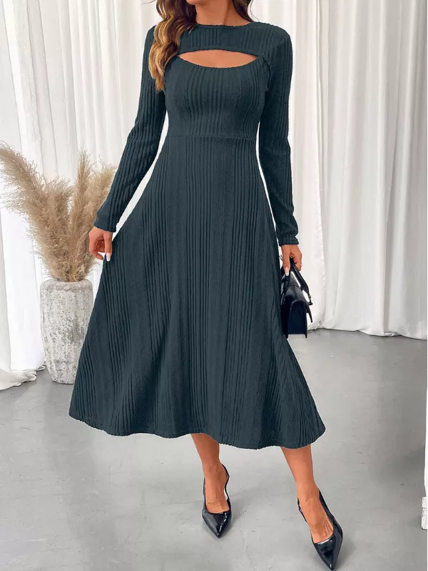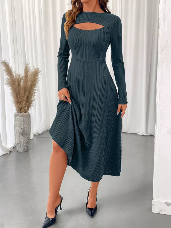 Striking a balance between sleek texture and modern detail, this Ribbed Knit Cutout Long Sleeve Midi Dress is designed for confident, contemporary wear. The ribbed finish adds depth to the silhouette, while the subtle cutout brings a fashion-forward element that feels refined rather than bold.