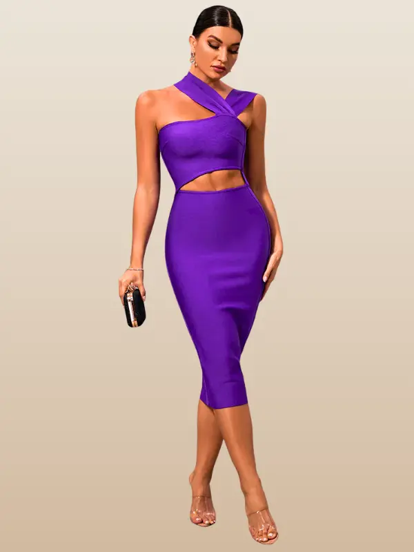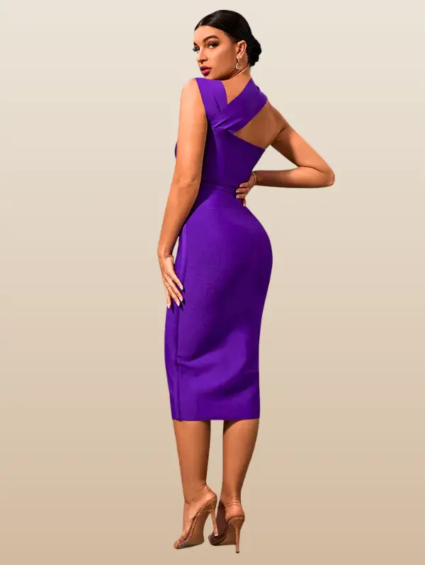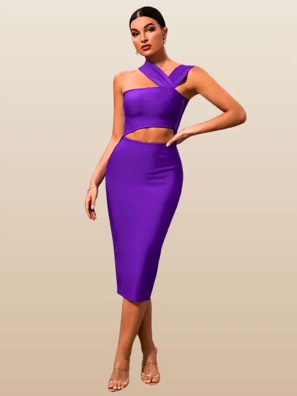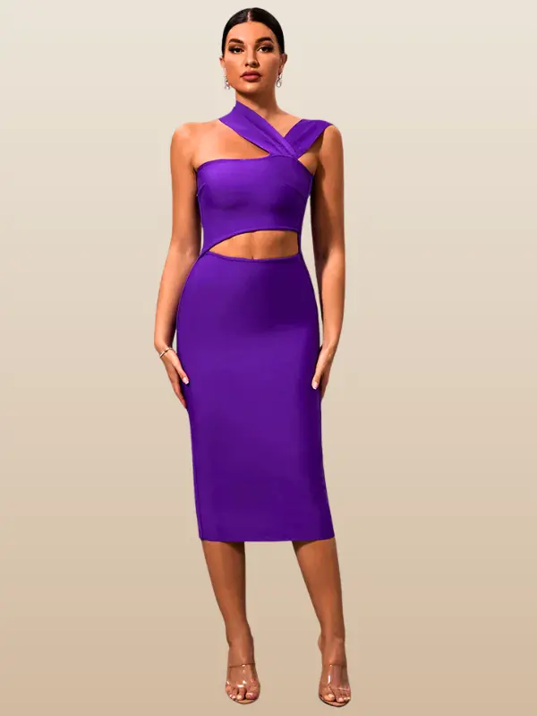 This bandage midi dress features a sleek, figure-contouring design that flatters from every angle. The asymmetric neckline and subtle waist cut-out create a contemporary edge, blending sophistication with daring detail. Its refined construction smooths and supports, making it a standout choice for elevated occasions.