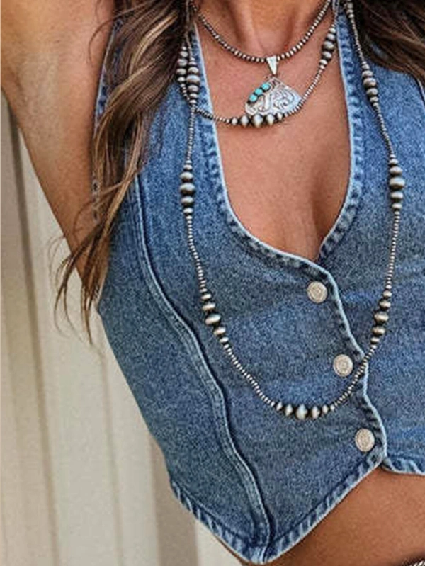 Inspired by the classic denim vest top women trend, this piece pairs effortlessly with high-waist jeans, trousers, skirts, or layered looks. Wear it open over basics for a casual feel or buttoned up for a more polished outfit.
