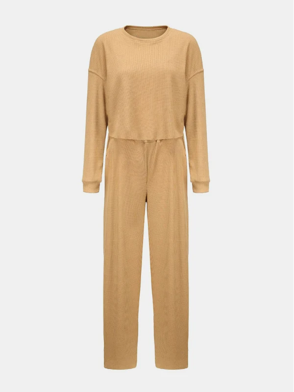 This 2-piece set features a round neck long-sleeve top paired with matching pants for a cohesive, comfortable silhouette. The waffle knit fabric offers breathability and softness, making it ideal for lounging, casual outings, or work-from-home days. Designed with ease in mind, the relaxed fit allows for natural movement throughout the day. Explore more coordinated looks in our Sets collection.