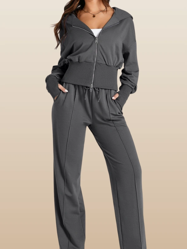 This hoodie and pants set women features a structured zip-up hoodie paired with comfortable, easy-fit pants that move naturally with the body. The streamlined silhouette makes it ideal for layering, casual routines, or travel days. Discover more performance-ready styles in our Activewear collection and explore coordinated outfits in our Sets collection.